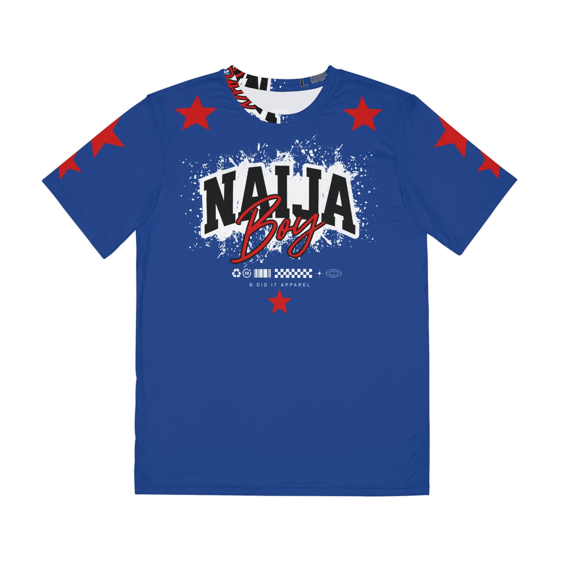A lightweight, all-over print tee made for city streets and loud personalities. The shirt’s bold "NAIJA Boy" graphic and red star accents bring a confident, urban energy—like turning a corner and feeling the beat of the neighborhood. Breathable brushed polyester keeps you cool through long days, while durable double-needle stitching and quick-dry fabric make it sturdy for frequent wear. It sits easily in a streetwear rotation: layered under a denim jacket, paired with joggers, or worn solo when you want the design to speak. This shirt carries attitude without sacrificing comfort—tailored for someone who moves fast, values durability, and wants their style to announce where they’re from and what they stand for.